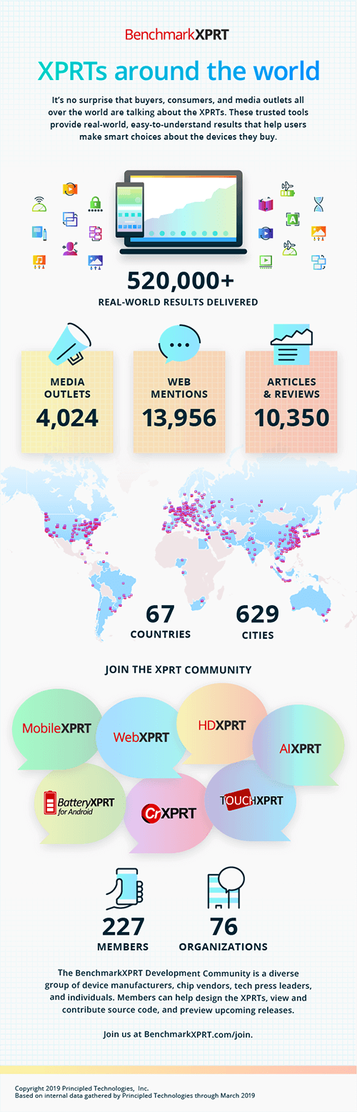 We encourage you to participate in the evolution of the XPRTs. Our diverse community includes over 75 corporations and organizations representing major PC, tablet, and smartphone manufacturers, chip vendors, and tech press leaders. Members can run the full XPRT family, take part in previews of new benchmarks, and access the source code. Add your voice to the XPRT mix.