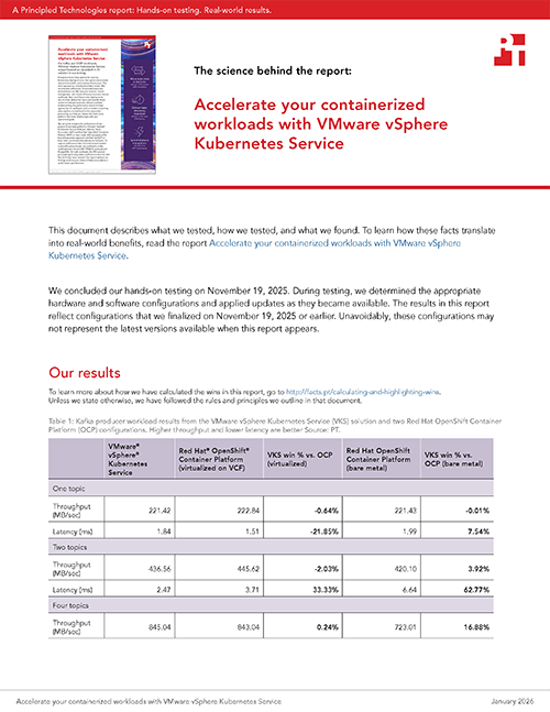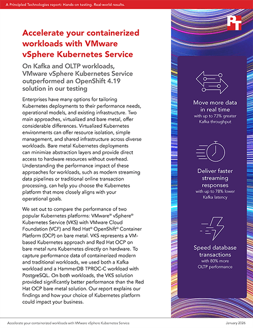 We set out to compare the performance of two popular Kubernetes platforms: VMware® vSphere® Kubernetes Service (VKS) with VMware Cloud Foundation (VCF) and Red Hat® OpenShift® Container Platform (OCP) on bare metal. VKS represents a VM-based Kubernetes approach and Red Hat OCP on bare metal runs Kubernetes directly on hardware. To capture performance data of containerized modern and traditional workloads, we used both a Kafka workload and a HammerDB TPROC-C workload with PostgreSQL. On both workloads, the VKS solution provided significantly better performance than the Red Hat OCP bare metal solution. Our report explains our findings and how your choice of Kubernetes platform could impact your business.