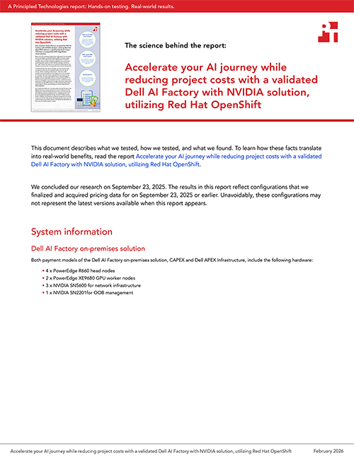 DISCLAIMER OF WARRANTIES; LIMITATION OF LIABILITY: Principled Technologies, Inc. has made reasonable efforts to ensure the accuracy and validity of its testing, however, Principled Technologies, Inc. specifically disclaims any warranty, expressed or implied, relating to the test results and analysis, their accuracy, completeness or quality, including any implied warranty of fitness for any particular purpose. All persons or entities relying on the results of any testing do so at their own risk, and agree that Principled Technologies, Inc., its employees and its subcontractors shall have no liability whatsoever from any claim of loss or damage on account of any alleged error or defect in any testing procedure or result.