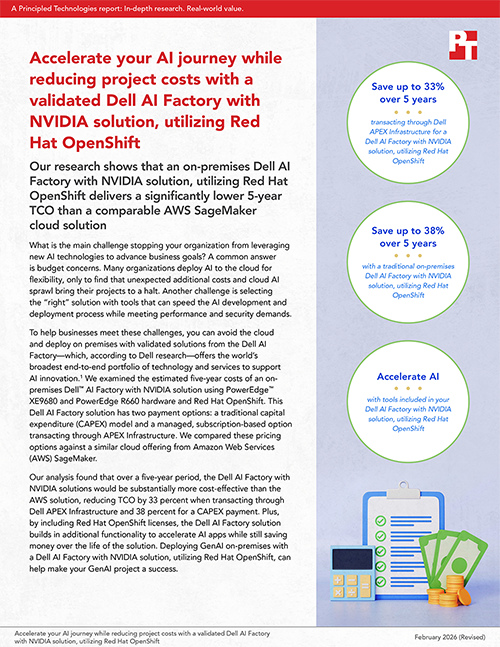 Organizations looking to advance their AI initiatives can face significant challenges around cost management, solution selection, and operational efficiency. The on-premises Dell AI Factory with NVIDIA solution utilizing Red Hat OpenShift addresses these concerns by offering a cost-effective infrastructure for GenAI. Additionally, the trusted Red Hat OpenShift Container Platform provides a platform for cloud-native apps that integrates with Dell and NVIDIA hardware to help organizations start transforming business operations quickly. Our research shows that the Dell AI Factory with NVIDIA solution—either purchased upfront or transacting through Dell APEX Infrastructure—can save organizations up to 38 percent over hosting on AWS SageMaker. With a solution from the Dell AI Factory, businesses can accelerate AI innovation, reduce long-term expenses compared to leading cloud alternatives, and deploy advanced AI workloads with confidence—all while maintaining control over their infrastructure and data.