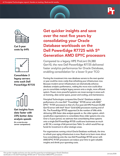 Principled Technologies compared the Oracle® Database analytics performance of a new Dell™ PowerEdge™ R7725 server with AMD™ EPYC™ 9175F processors to that of a five-year-old HPE ProLiant DL380 Gen10 server with Intel® Xeon® Gold 6242 processors nearing end of life. The PowerEdge R7725 supported 3x the number of VMs while delivering 23% faster data analysis speeds vs. the older system, which would allow organizations to consolidate three older systems into one. Over a 5-year period, we estimate that consolidating three systems onto a single Dell PowerEdge R7725 could save businesses as much as $2.1M, a savings of 64 percent (see Table 1)—which would free up funds for investment in other strategic areas.