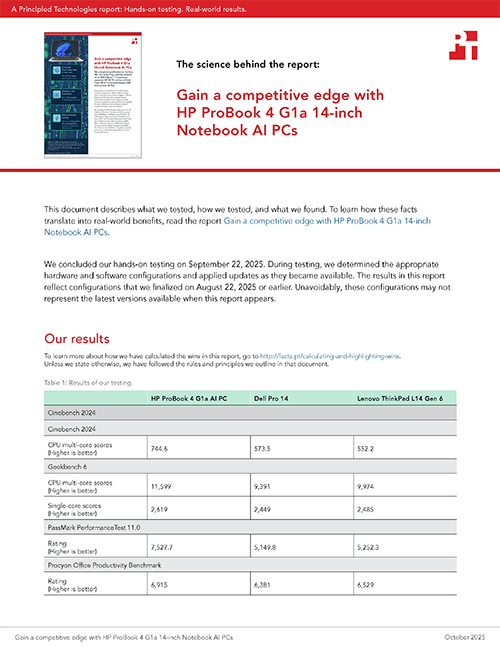 In these system performance evaluations, we found that the AMD Ryzen™ 7 250 processor-powered HP ProBook 4 G1a came out ahead of the two Intel Core Ultra 7 255U processor-powered AI PCs we tested. The HP AI PC received notably higher scores in the Cinebench 2024 and PassMark PerformanceTest 11 comparisons. These higher system performance scores indicate that investing in AMD Ryzen™ 7 250 processor-powered HP ProBook 4 G1a AI PCs would help users complete day-to-day tasks in less time than the Intel Core Ultra processor-based AI PCs we tested.