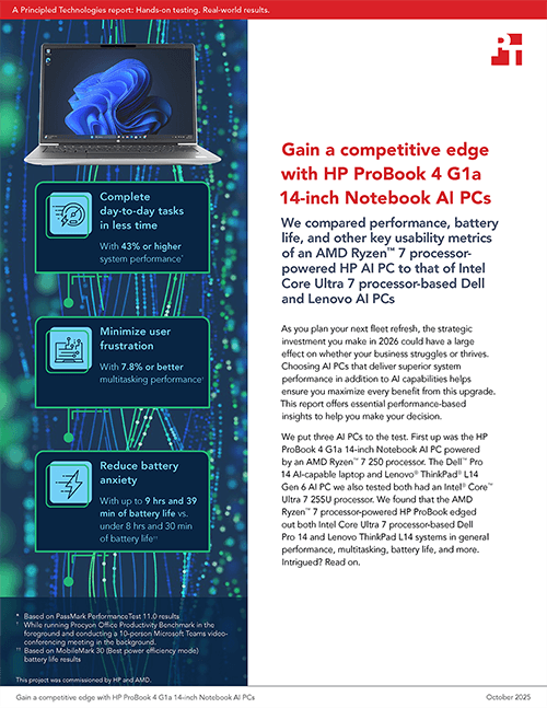 In our system, multitasking, battery, and sustained performance comparisons, a HP ProBook 4 G1a 14-inch Notebook AI PC powered by an AMD Ryzen™ 7 250 processor edged out two Intel Core Ultra 7 255U processor-based AI PCs: a Dell Pro 14 Laptop and a Lenovo ThinkPad L14 Gen 6. With higher benchmark scores, better battery performance metrics, and better multitasking performance, the AMD Ryzen™ 7 processor-powered HP ProBook 4 G1a offers a compelling choice for businesses seeking to maximize productivity and efficiency in their 2026 fleet refresh.