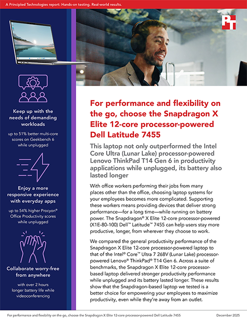 deliver strong performance—for a long time—while running on battery power. The Snapdragon® X Elite 12-core processor-powered (X1E-80-100) Dell™ Latitude™ 7455 can help users stay more